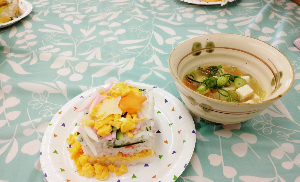 今回みんなで挑戦したのは、見た目も華やかな「ひし形ちらし寿司」と「ゴロゴロ野菜のおすまし」の2品です。